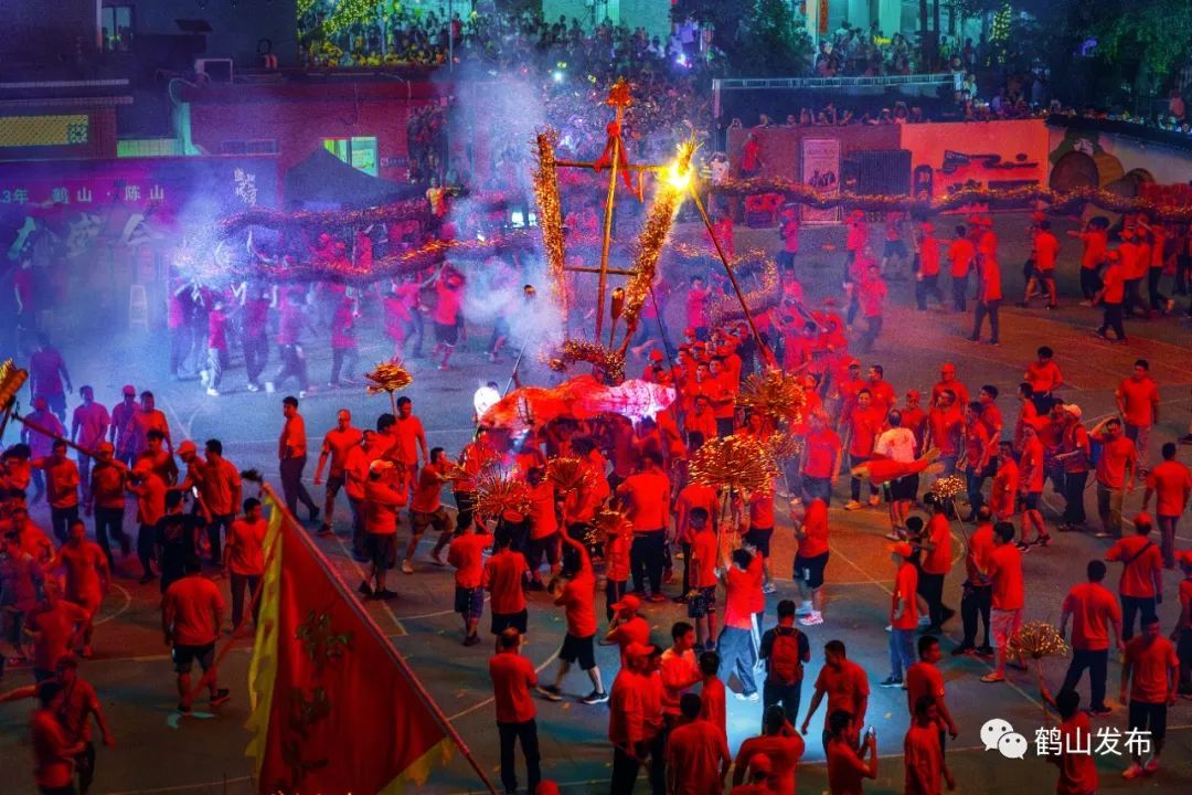 晚上8时30分,龙头、龙身和龙尾完成香火燃点,长约100米的香火龙正式起龙,在龙珠和鱼灯的引领下,蜿蜒巡游在陈山各村巷中,沿途鞭炮声此起彼伏,热闹非凡。晚上九时半,香火龙到达陈山村内的学校操场进行“盘龙”表演。此时,龙鼓急敲、烟花灿烂,香火龙在操场上尽情起舞,作出各种盘龙造型,将这场鹤味传统文化盛宴推向高潮,现场观众的热情也到达顶点。