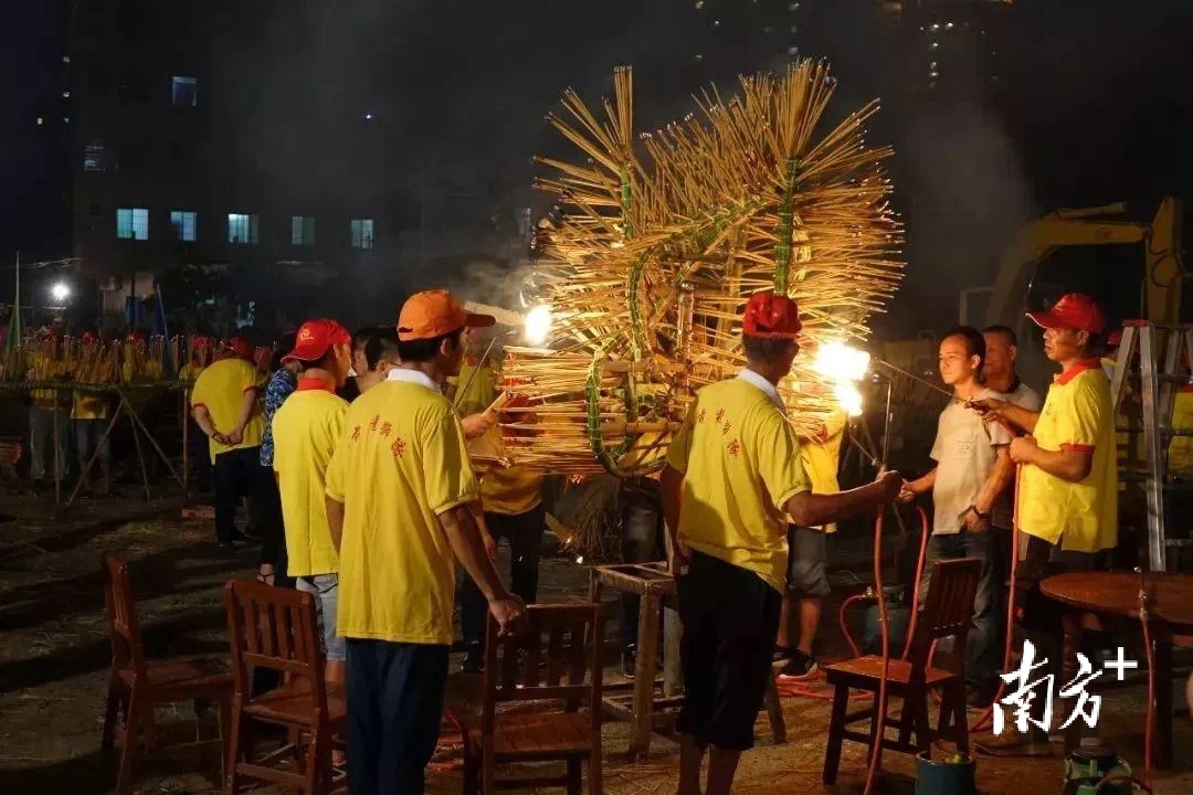 节日前夕,村民用檀香、芋荚等扎制成一条长龙,中秋当晚村里的舞龙者将扎制的长龙抬到祠堂,点燃香火并插满龙身。