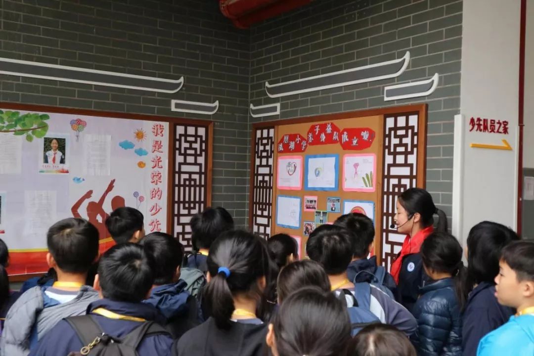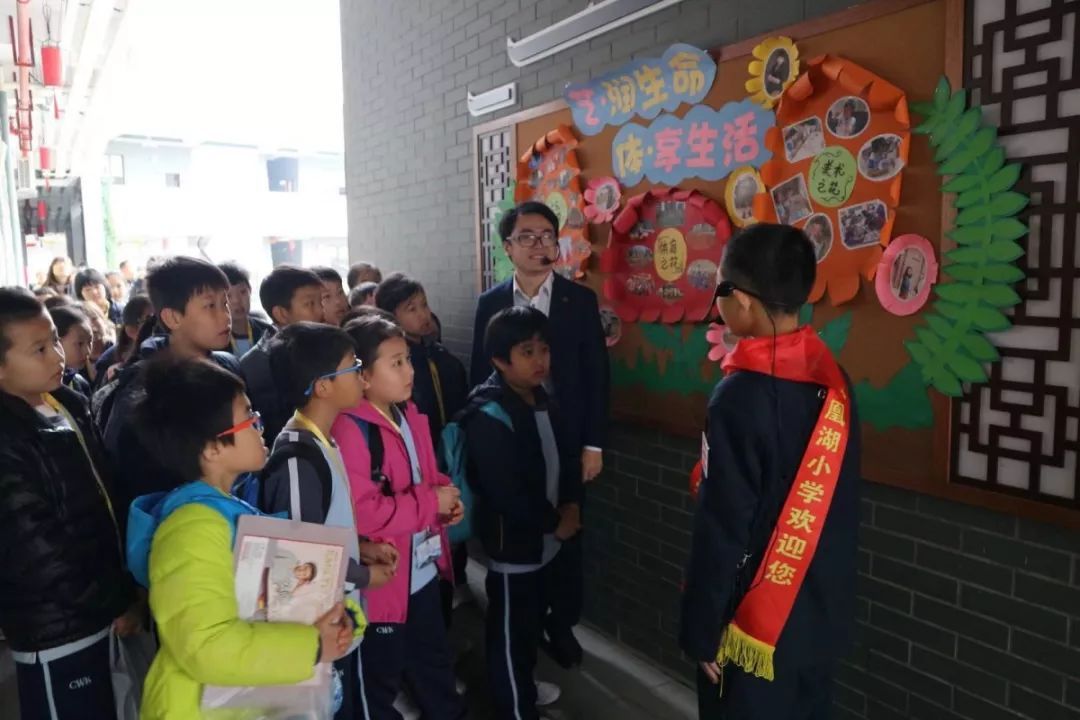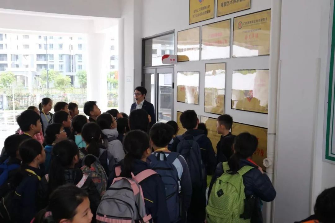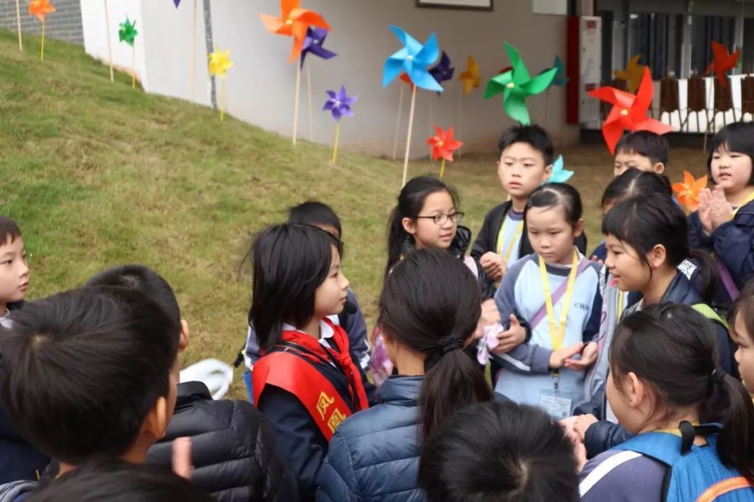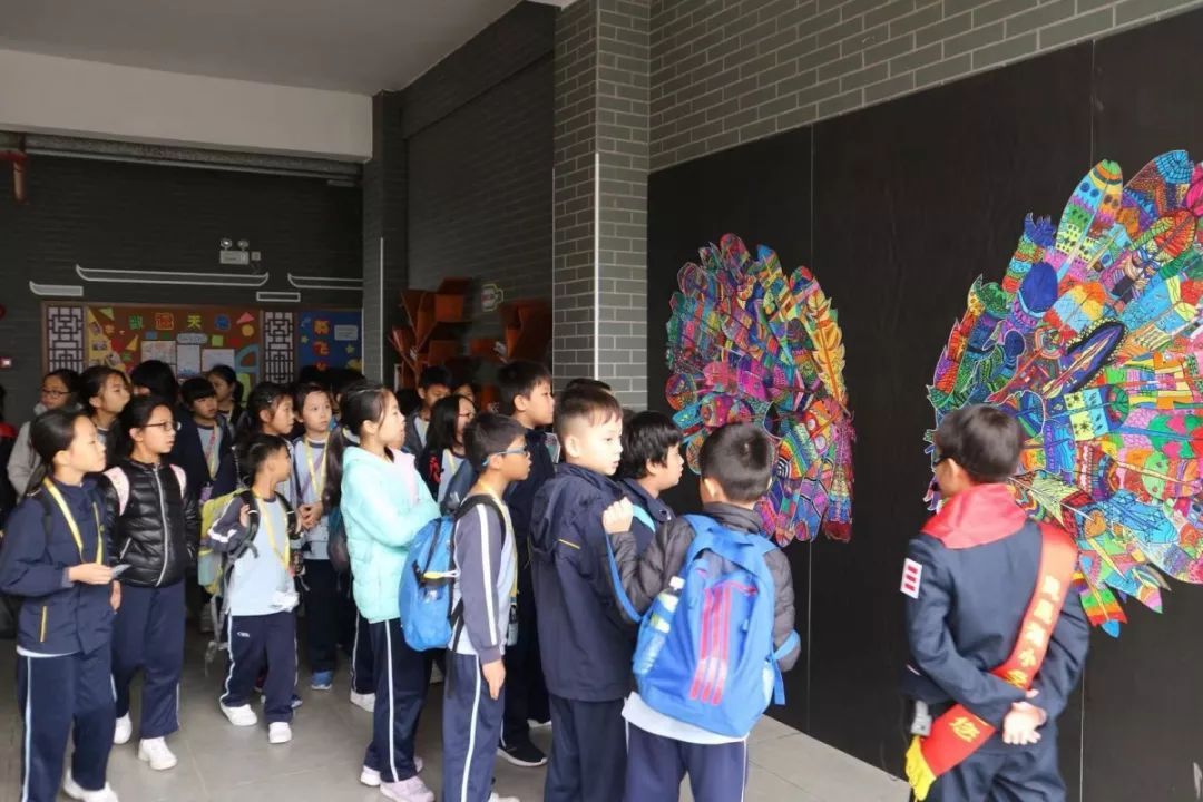学校大队部安排了教师讲解和学生讲解,为香港和贵州的师生们参观校园提供引导。校园一草一木皆是风景,也都蕴藏着文化——教师风采墙铭记着我们的教育信条;绿荫走廊记录了我们的开创者的汗水;功能场室里充满了学生们课程中的倩影;科组板报和移动展板都展示了学生自己的作品;各班的雏鹰园地各具特色,提炼了以24节气命名的中队文化;孩子们一人一根羽毛拼成的翅膀墙与七彩风车山遥相呼应,寓意学校为孩子们努力搭建“心怀梦想,展翅高飞”的平台。我们的老师懂学校的文化,我们的小讲解员理解学校的文化,我们每个班的孩子们也都能说出学校和自己班级的文化。打造我校的特色文化是我们教育教学开放的基石。