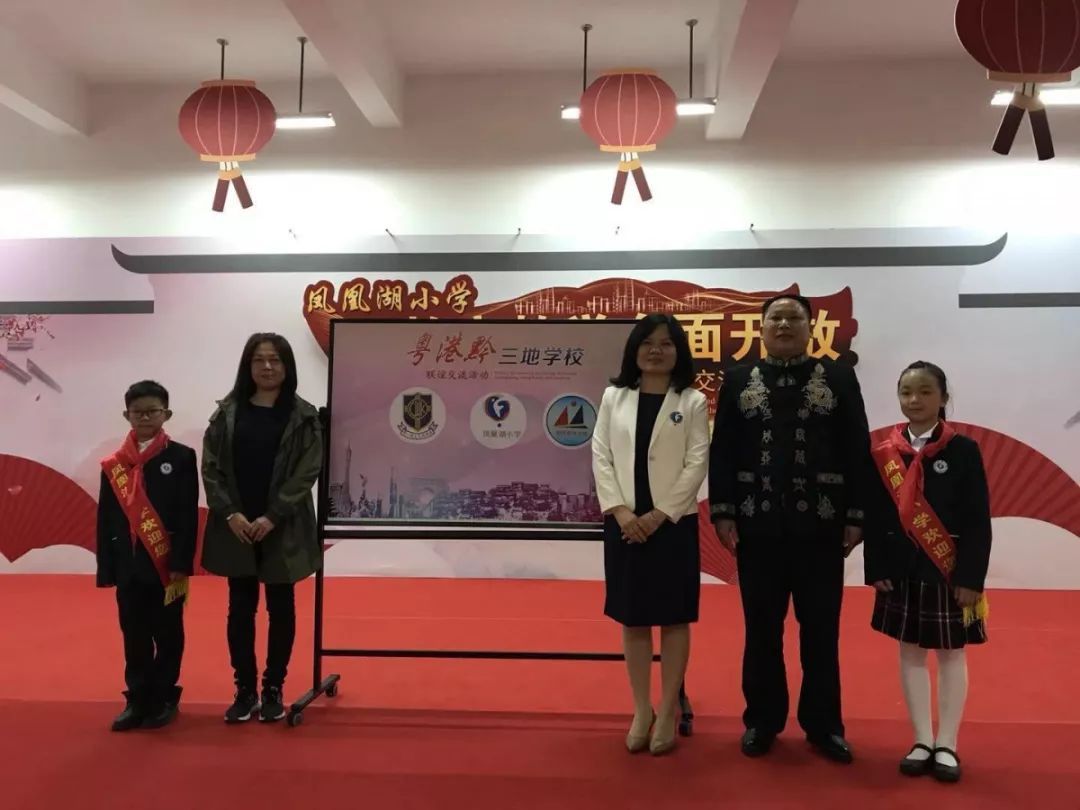 上午11时,所有宾客相聚于多功能厅,共同见证粤港黔三地学校联谊交流启动仪式。我校饶政校长首先上台致辞,对香港和三都师生们的到来表示热烈欢迎。所有人员一同观看了解了粤港黔三地学校的概况之后,凤凰湖小学和柴湾角小学两校校长与两校学生代表均互赠纪念品,以示友谊;三都鹏城希望学校也赠与我校一幅水族马尾绣作品,表达情意。最激动人心的一刻是三所学校的校长共同上台,在三地联谊海报板上贴上代表学校的校徽,标志本次联谊交流活动圆满举行!最后,广州市黄埔区教育局许卫民副局长总结致辞,他表示凤凰湖小学位于知识城南起步区核心地带,具有优越的地理环境和发展条件,学校善于抓住粤港澳大湾区的发展契机,与香港学校进行联谊交流,有利于教育教学资源的优势互补;同时学校积极帮扶三都鹏程希望学校,实现教育资源和经验的共享,希望未来三地学校多多交流,祝愿三校友谊之树常青!