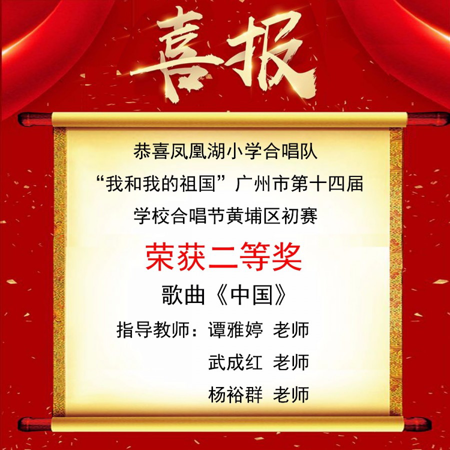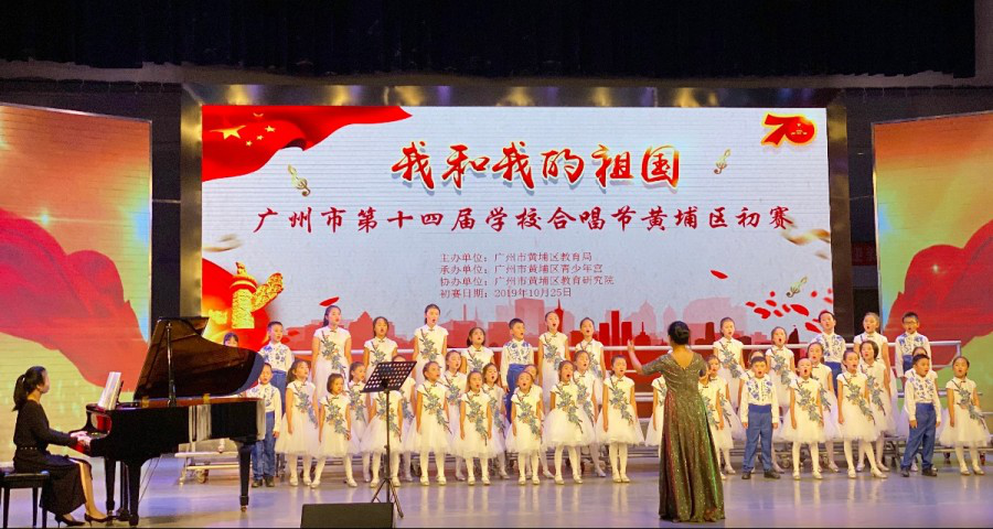 2019年10月25日,广州市第十四届学校合唱节黄埔区初赛在黄埔区少年宫金点点剧场隆重开幕。我校杨裕群老师、谭雅婷老师和武成红老师带领我校合唱队员参赛。