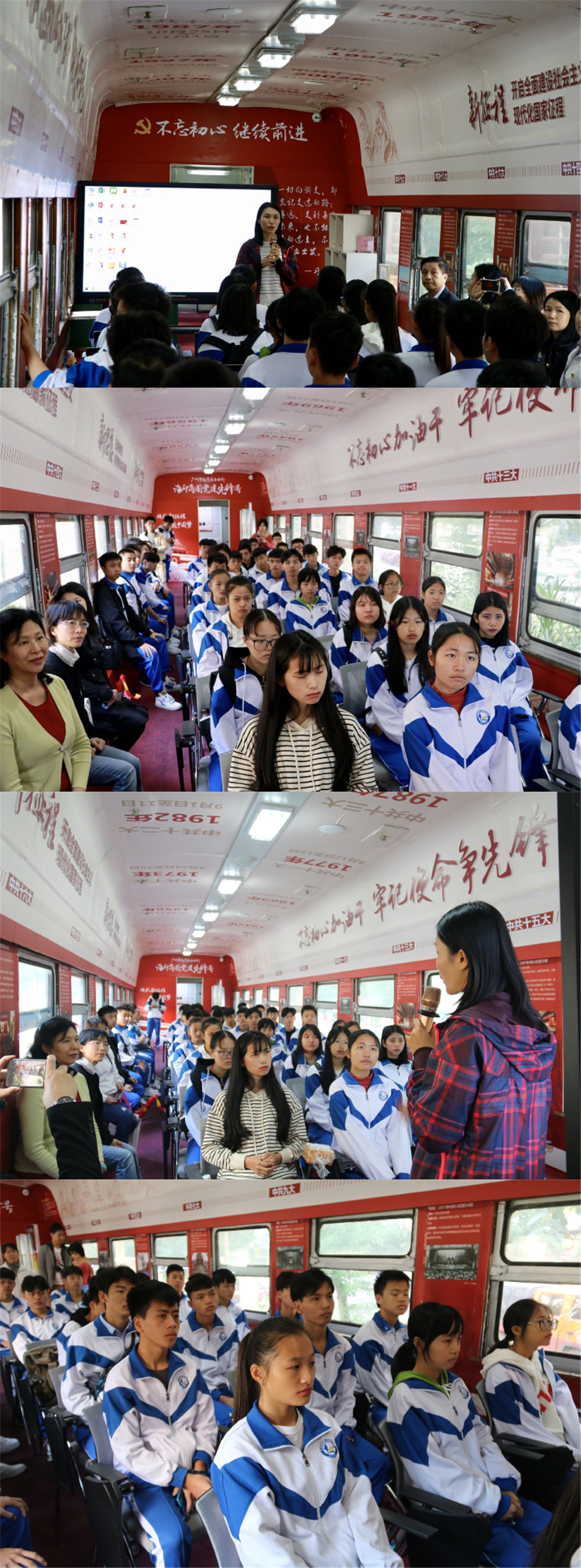 迫不及待地登上这列广九老火车,走进车厢,一条充满红色记忆的“时间长廊”徐徐展开;左右两侧厢壁上,展示了历次党代会的基本情况;一抬头,历次党代会的时间轴在车厢顶部错落排开;车厢尾部是“红色书吧”,由两个绿皮车厢卡座和几个错落有致的书架组成,为党员和参观者提供学习平台。同学们对这个极具创新性的党群服务中心感到很新奇,听着工作人员的讲解,都在细细地看,静静地读,慢慢地品,这样的参观,真是一次印象深刻的党史学习!