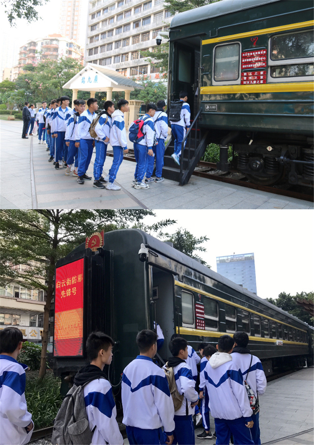 海印党建先锋号坐落在广九铁路纪念园内,一个蒸汽机火车头,两节绿皮硬座车厢,沧桑与现代巧妙融合在一起,立即就吸引了同学们的眼球。
