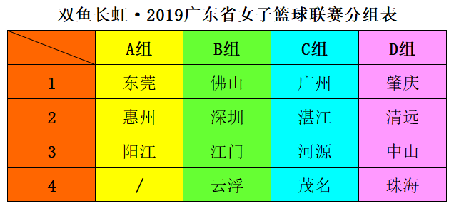 按 2018 年联赛排名进行蛇形排列(未参加 2018年联赛的参赛队按报名先后顺序落位) , 将15支参赛队分成 A、 B 、C、D组进行小组单循环比赛。其中,A组有:东莞、惠州、阳江;B组有:佛山、深圳、江门、云浮;C组有广州、湛江、河源、茂名;D组有肇庆、清远、中山、珠海。