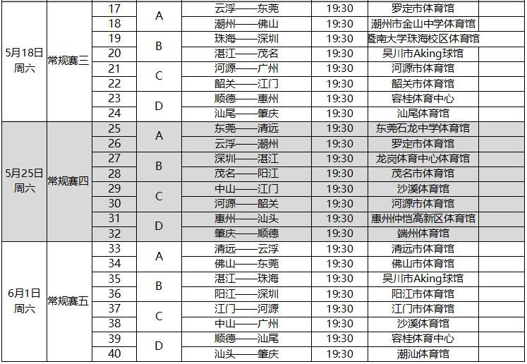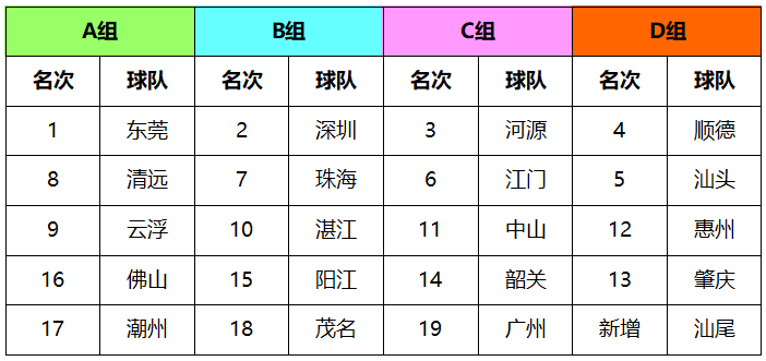 今年联赛继续采用“主客场制”,20支球队按照上赛季成绩蛇形排列分为四个组别,新增加的汕尾队则按顺序落位。